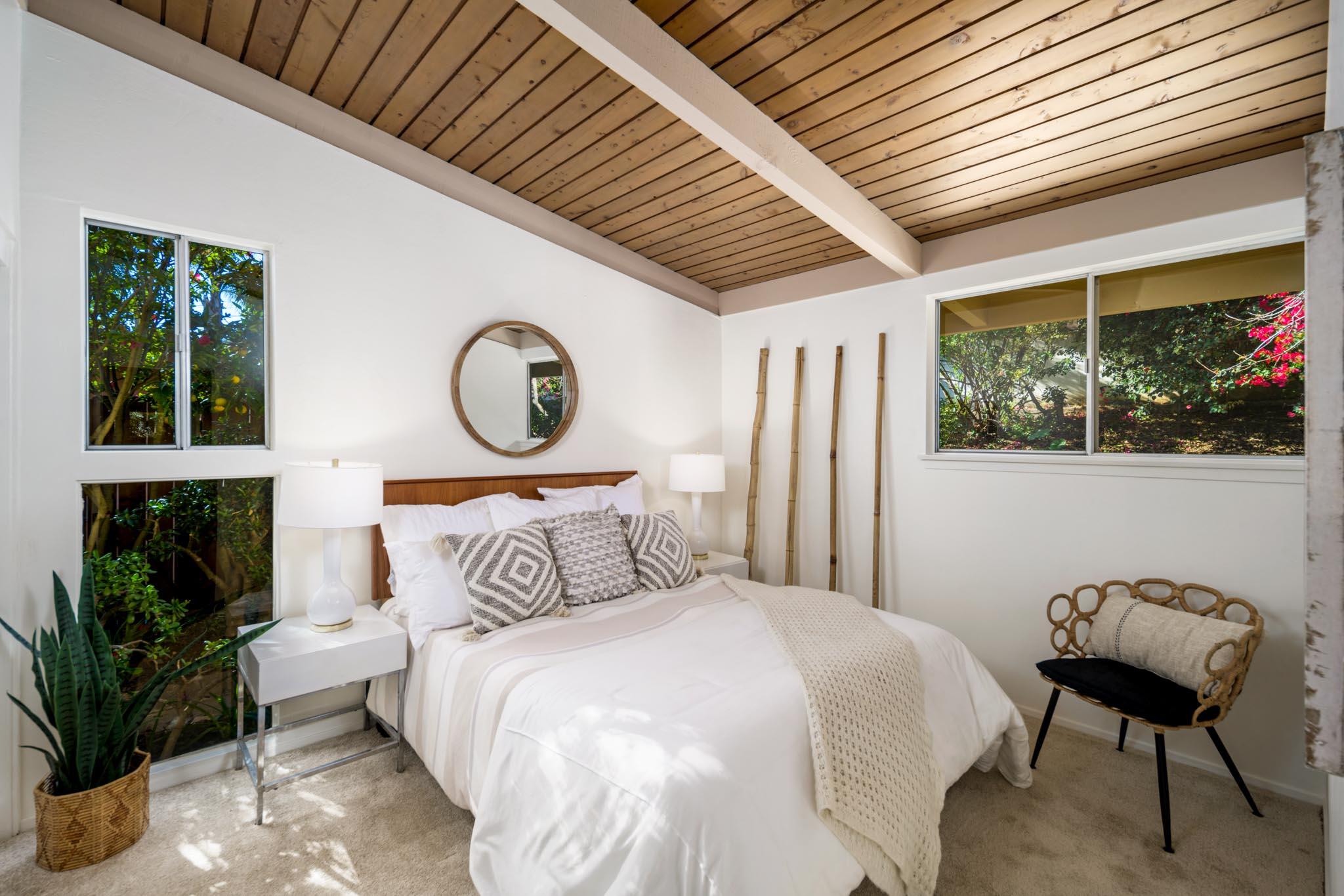 Ideally perched at the top of a quiet cul-de-sac, this 3-bedroom, 2-bathroom home enjoys an elevated setting with peaceful mountain views and a true sense of privacy. Floor-to-ceiling windows and glass French doors flood the main living spaces and kitchen with natural light, seamlessly connecting indoors to the surrounding landscape, while high ceilings throughout create an open ambiance. The primary suite features an en-suite bathroom and French doors that open directly to the backyard. Mature landscaping and fruit trees frame the front yard, with a charming flagstone patio and walkway. A spacious garage with a dedicated workshop area completes the property. Centrally located near bike paths, shopping, restaurants, transportation, and schools, and situated in Foothill Elementary school.